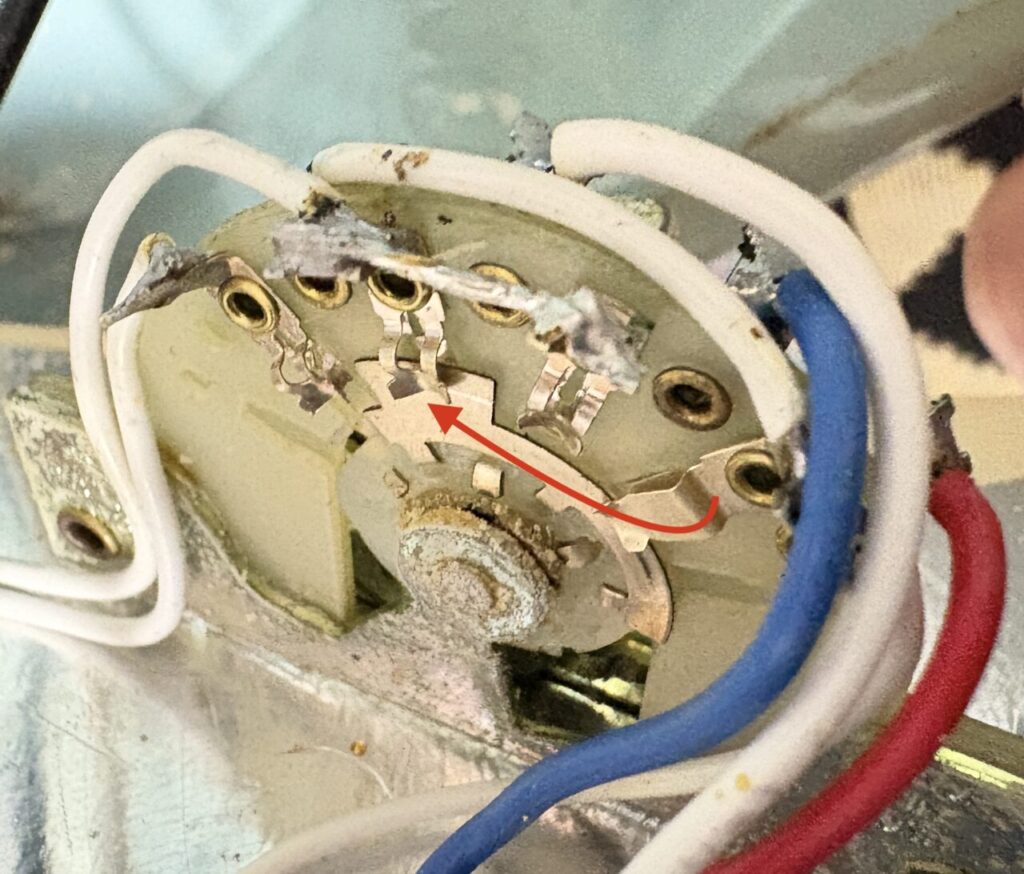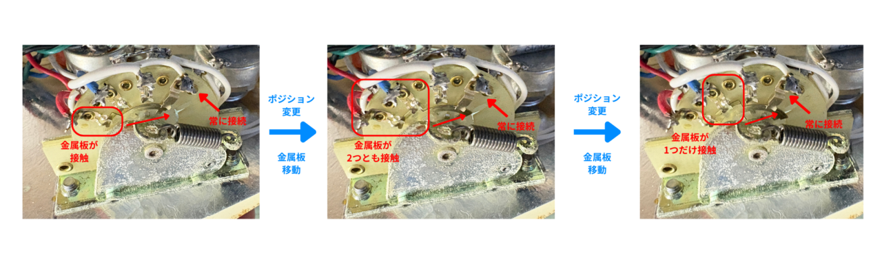 かなり見づらいですが、左端の金属板がポジションに応じて移動していくことで、接続先が切り替わります。