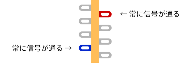 青色同士、赤色同士がそれぞれ導通します。