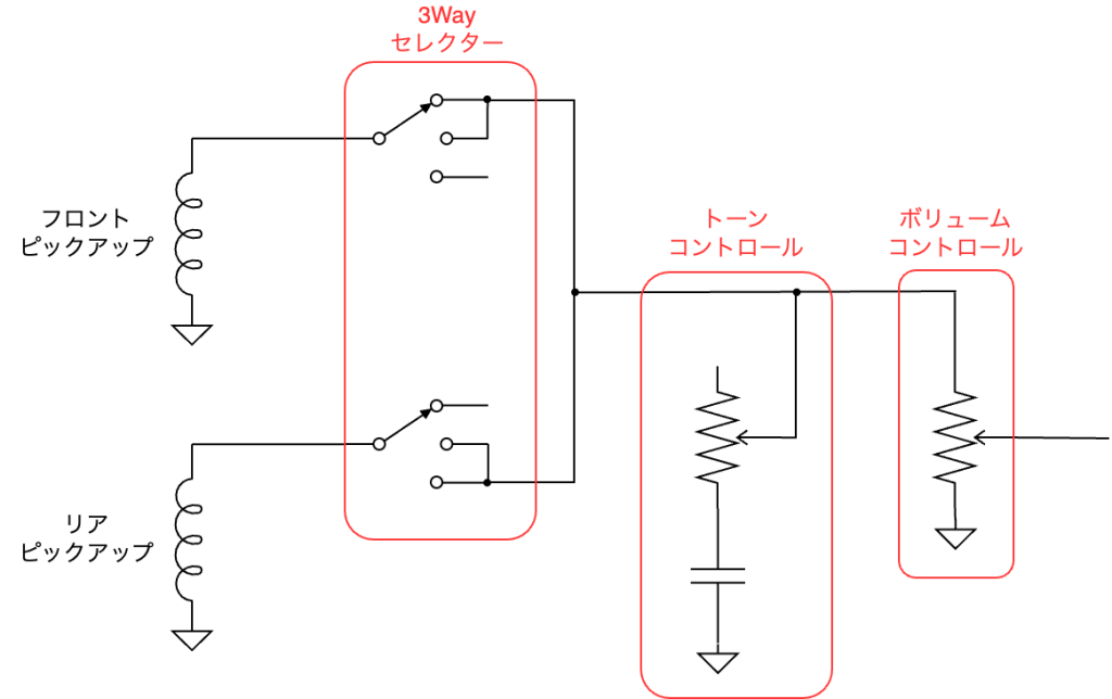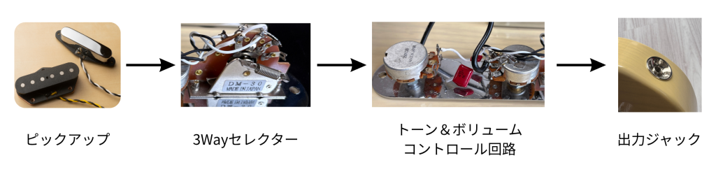 ピックアップで音が発生してから出力ジャックに出ていくまでの流れは下記の通りです。