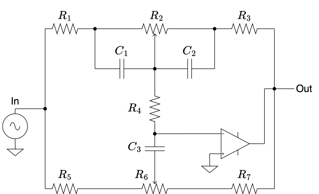 これは、Peter Baxandall氏が1952年に発表したトーンコントロール回路で、現在もオーディオ機器などで広く使われています。