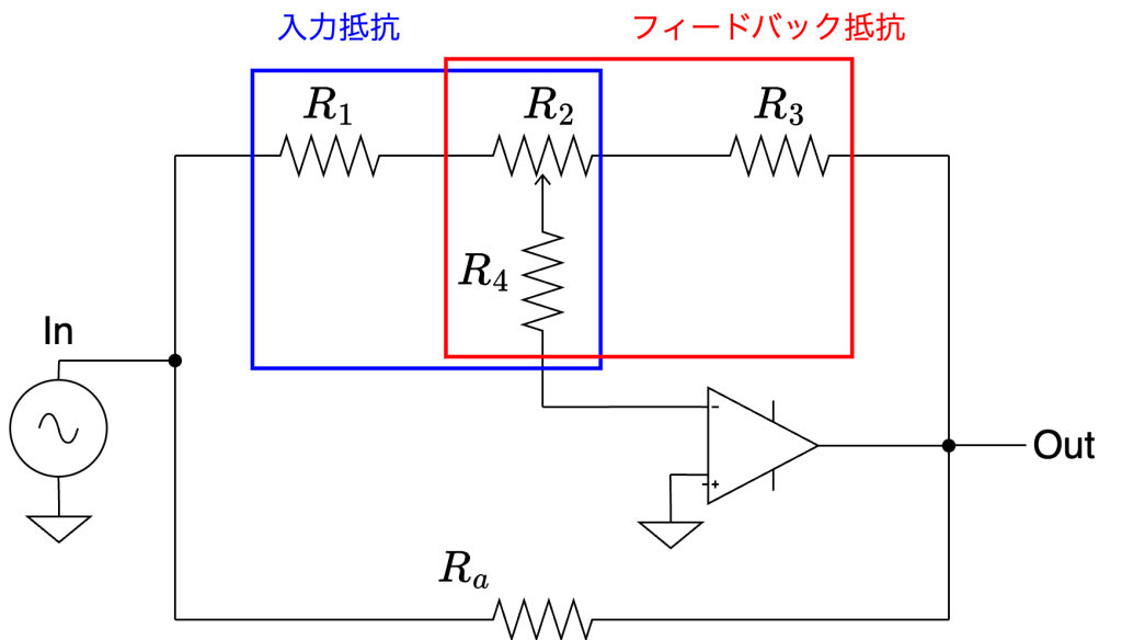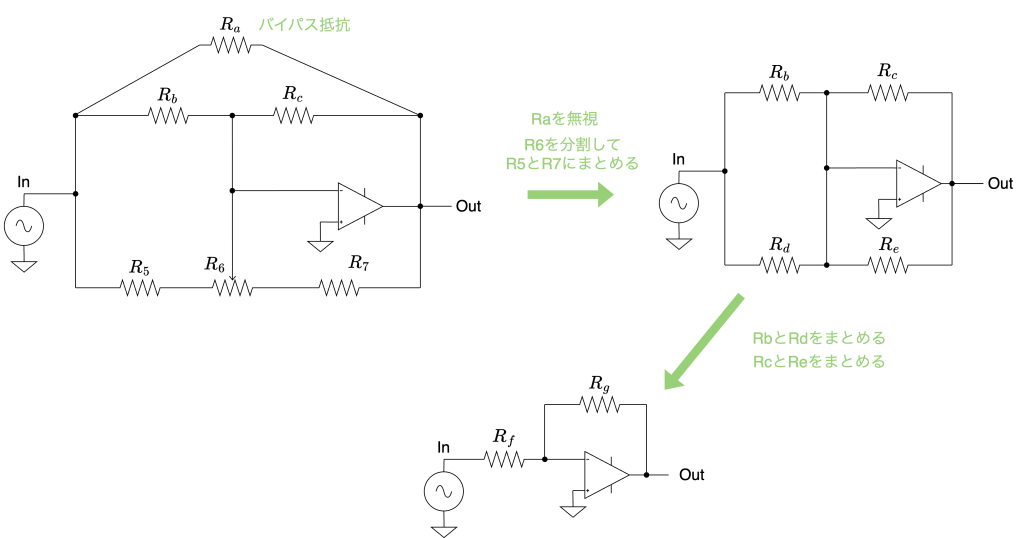 R5〜R7の部分は1本の抵抗Raとして扱えます。これは入力と出力を直接結ぶバイパス抵抗であり、