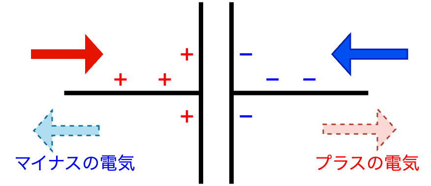 それに引き寄せられるように、もう一方の金属板にはマイナスの電気が集まります。