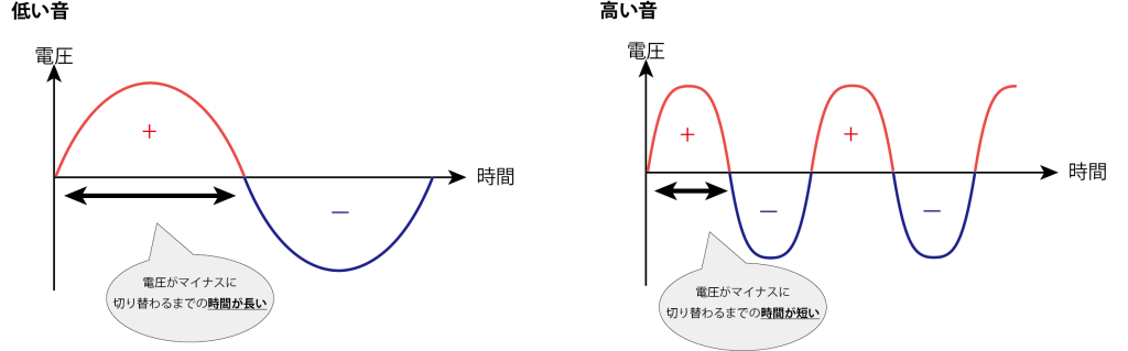 低い音(低周波)の場合、電圧がプラスからマイナスに切り替わるまでの周期が長くなります。