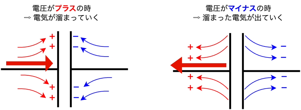 電気がコンデンサにたまる前に電圧の向きが反転してしまうため、 常に電荷が移動し続ける状態が保たれます。結果として「電気が通っているように見える」わけです。