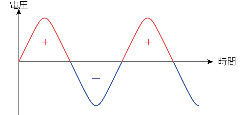 これは、電圧がプラスの時には左から右へ、マイナスの時には右から左へ流れるということになります。
